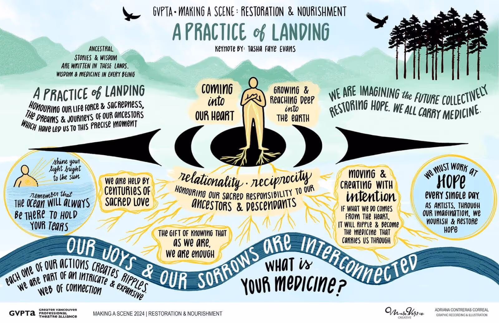 Our day included a nourishing meal and a keynote by Tasha Faye Evans. Graphic recorder Adriana Contreras recorded observations throughout the day, reflected back in illustrations. Find the graphic recordings above.